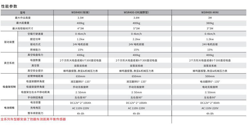 WSR400分为mini型,后驱和前驱三个规格,是WSR系列里面规格最小的车型,尤其适合室内玻璃安装,且可根据工地路况选择前驱或者后驱规格。以及板材大小选择不同车型,WSR400系列也是所有车型里价格最低的。性价比最优。